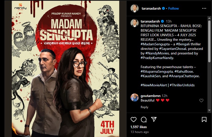 ঋতুপর্ণা সেনগুপ্ত অভিনীত ‘ম্যাডাম সেনগুপ্ত-আবোল তাবোল হত্যা রহস্য’ ছবির পোস্টার মুক্তি পেয়েছে। হত্যারহস্যের প্রেক্ষাপটে এই ছবি। যেহেতু বাংলা ছবি, শিল্প-সংস্কৃতির ছোঁয়া। পোস্টারেও সেই ঝলক স্পষ্ট বোঝা যাচ্ছে।