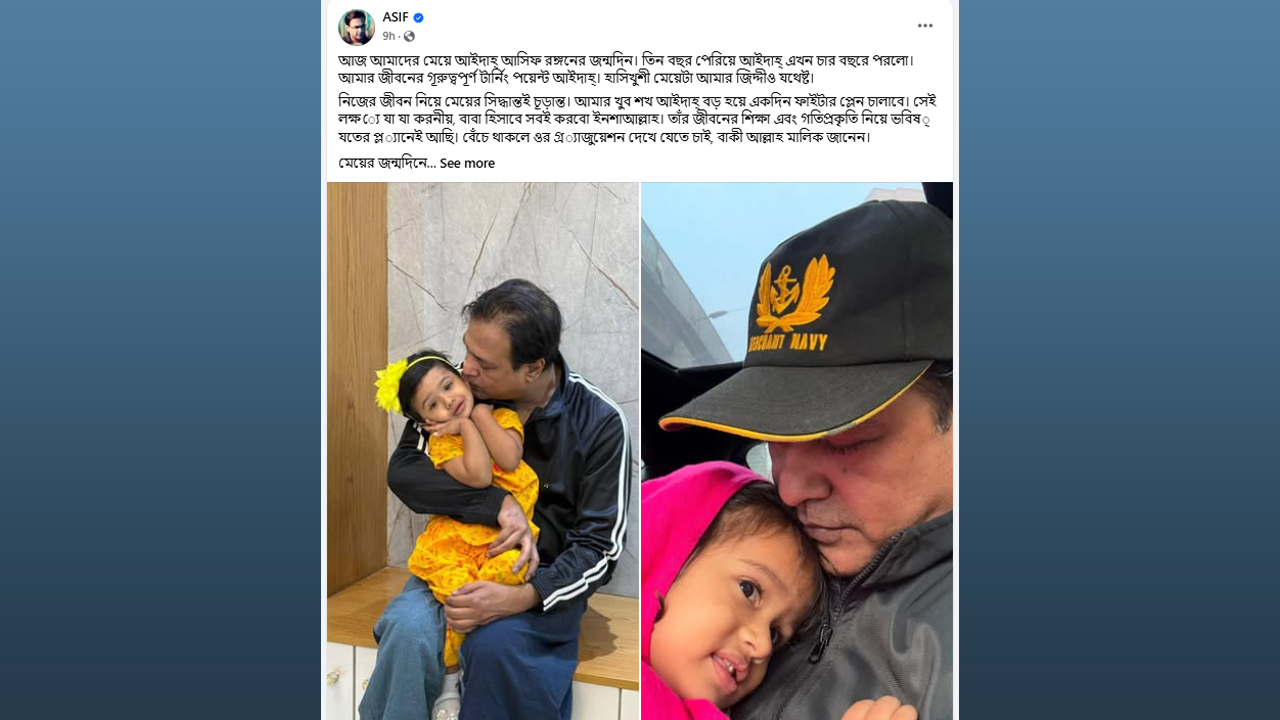 মেয়ের জন্মদিনের কথা উল্লেখ করে আসিফ আকবর লিখেছেন, ‘আজ আমাদের মেয়ে আইদাহ্ আসিফ রঙ্গনের জন্মদিন। তিন বছর পেরিয়ে আইদাহ্ এখন চার বছরে পরলো। আমার জীবনের গুরুত্বপূর্ণ টার্নিং পয়েন্ট আইদাহ্। হাসিখুশি মেয়েটা আমার জিদ্দীও যথেষ্ট।’
