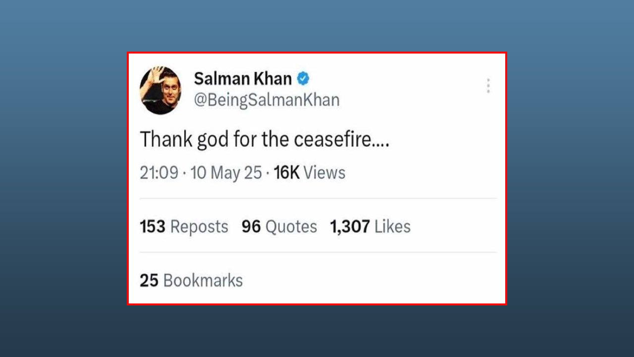 জম্মু-কাশ্মিরের পেহেলগামে হামলার ঘটনায় পর এবার যুদ্ধবিরতিতে সম্মত হয়েছে ভারত-পাকিস্তান। এ যুদ্ধবিরতির সিদ্ধান্তকে সমর্থন করে সামাজিক যোগাযোগ মাধ্যমে মুখ খুলেছেন বলিউডের অনেক তারকা। সেই তালিকায় রয়েছেন ভাইজান সালমান খানও।