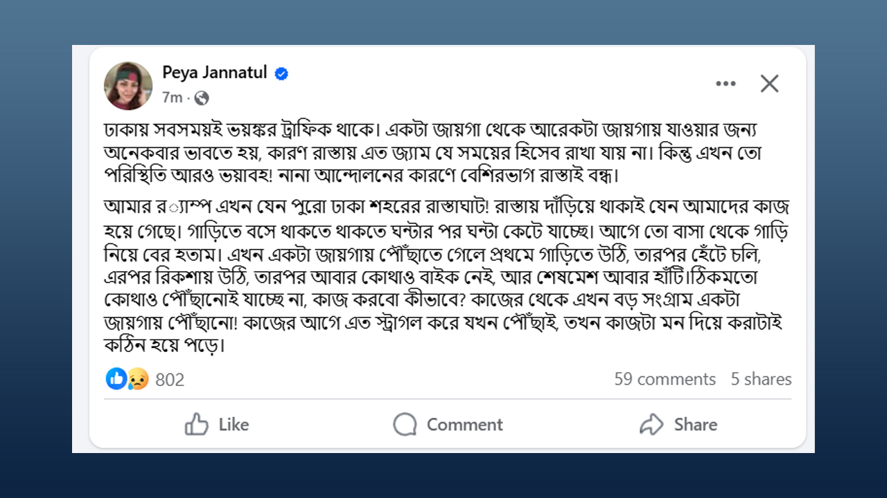 এদিকে সামাজিক যোগাযোগ মাধ্যমে পিয়া জান্নাতুল বেশ সক্রিয় রয়েছেন। এবার ঢাকার ভয়ংকর ট্যফিক নিয়ে কথা বলেছেন। তিনি পোস্ট দিয়ে লিখেছেন, ‘ঢাকায় সবসময়ই ভয়ংকর ট্রাফিক থাকে। একটা জায়গা থেকে আরেকটা জায়গায় যাওয়ার জন্য অনেকবার ভাবতে হয়, কারণ রাস্তায় এত জ্যাম যে সময়ের হিসেব রাখা যায় না। কিন্তু এখন তো পরিস্থিতি আরও ভয়াবহ! নানা আন্দোলনের কারণে বেশিরভাগ রাস্তাই বন্ধ।’