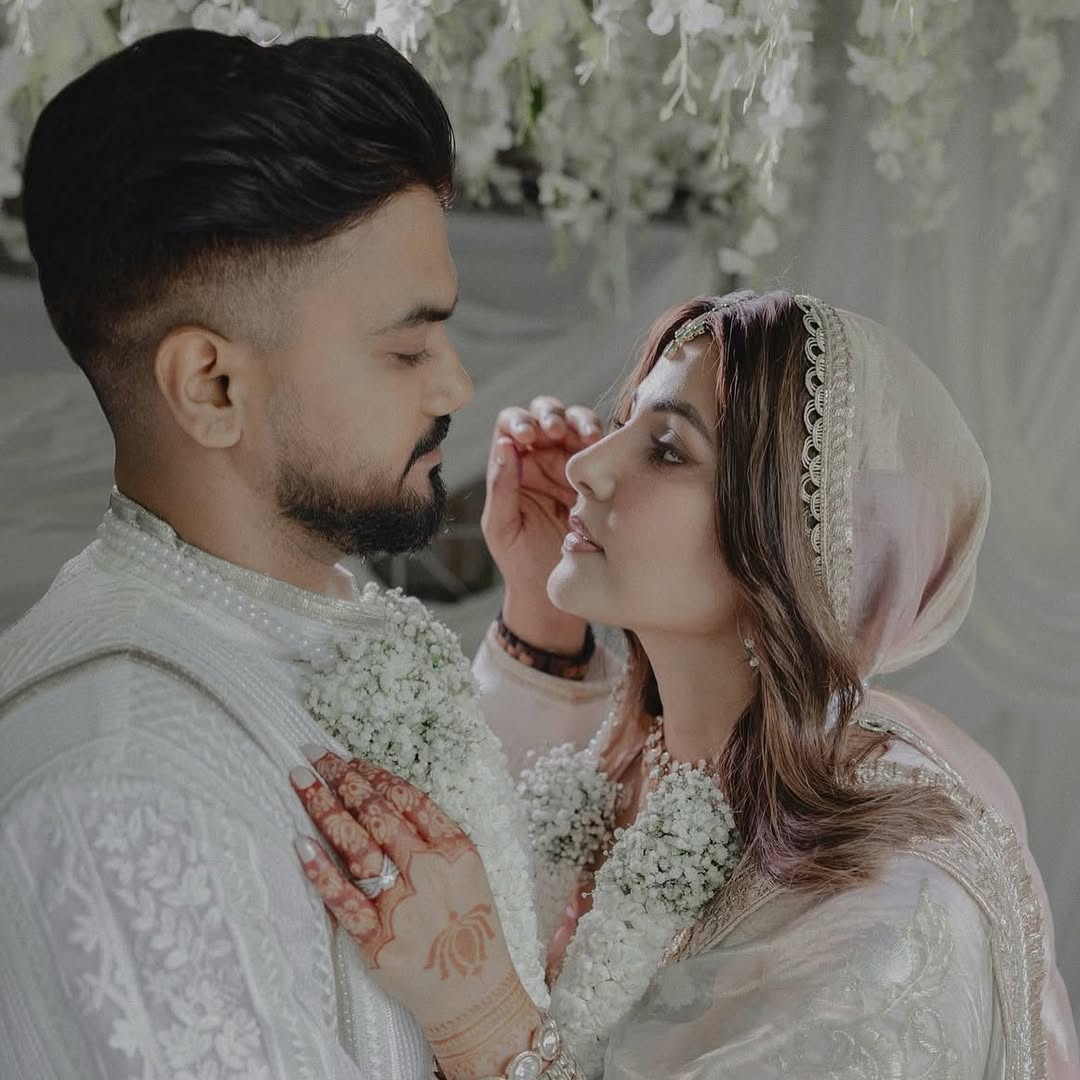একেবারে সাদামাটা আয়োজনে, শুভ্র পোশাকে, হাতে উজ্জ্বল হীরের আংটি—তাদের বিয়ের মুহূর্ত যেন আরও আবেগঘন করে তুলল পরিস্থিতিকে।