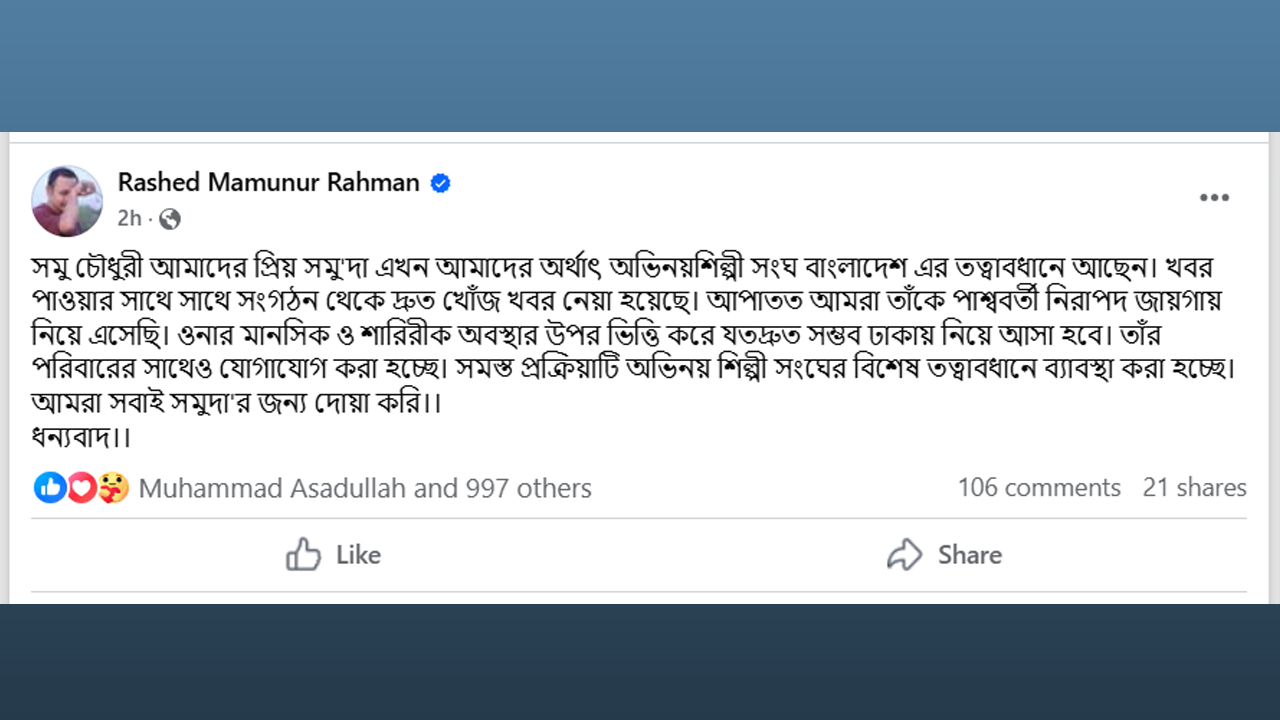 শেষে লিখেছেন, ‘তাঁর পরিবারের সাথেও যোগাযোগ করা হচ্ছে। সমস্ত প্রক্রিয়াটি অভিনয় শিল্পী সংঘের বিশেষ তত্বাবধানে ব্যাবস্থা করা হচ্ছে। আমরা সবাই সমুদা'র জন্য দোয়া করি, ধন্যবাদ।’