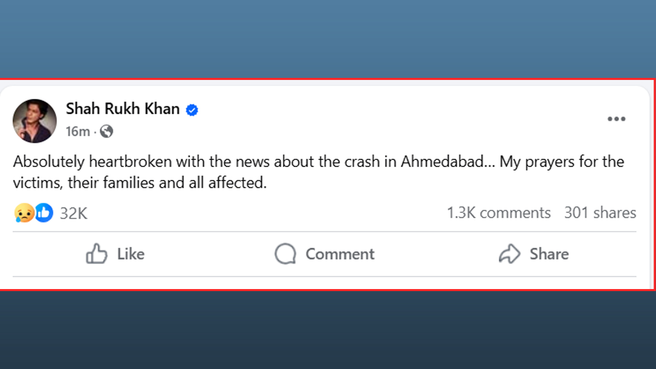 ভারতের গুজরাটের আহমেদাবাদে ভয়াবহ বিমান দুর্ঘটনায় বিমানে থাকা ২৪২ আরোহীর সবাই নিহত হয়েছেন। এ ঘটনায় সাধারণ মানুষের পাশাপাশি বলিউডে তারকা মহলের মাঝে শোকের ছায়া নেমে এসেছে। সামাজিক যোগাযোগ মাধ্যমে এক পোস্ট দিয়ে বলিউড বাদশাহ শাহরুখ খান এক আবেগঘন পোস্ট দিয়েছেন।