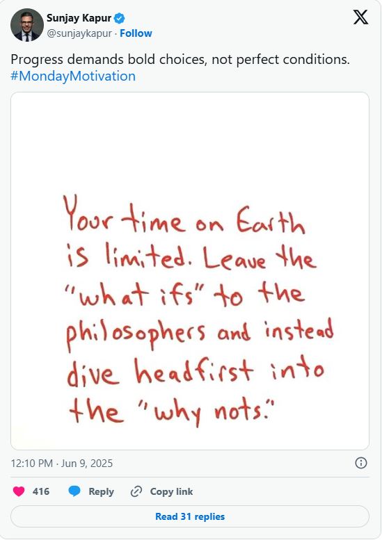 আর ঠিক এই পোস্ট নিয়ে রহস্য ঘনিয়েছে। নেটিজেনদের মধ্যে প্রশ্ন, তাহলে কি মৃত্যুর আগে কিছু টের পেয়েছিলেন সঞ্জয় কাপুর?