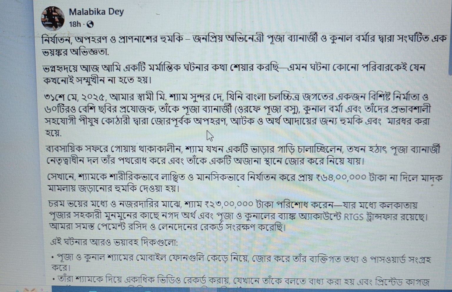 পরিচালকের স্ত্রীর ফেসবুক পোস্ট অনুযায়ী, গত ৩১ মে ২০২৫—গোয়ায় ব্যবসায়িক সফরে থাকা অবস্থায় অভিনেত্রী পূজা ব্যানার্জি, তার স্বামী কুণাল বর্মা এবং তাঁদের বন্ধু পীযূষ কোঠারির বিরুদ্ধে প্রযোজক শ্যামসুন্দর দে-কে অপহরণ ও ভয় দেখিয়ে অর্থ আদায়ের অভিযোগ ওঠে।