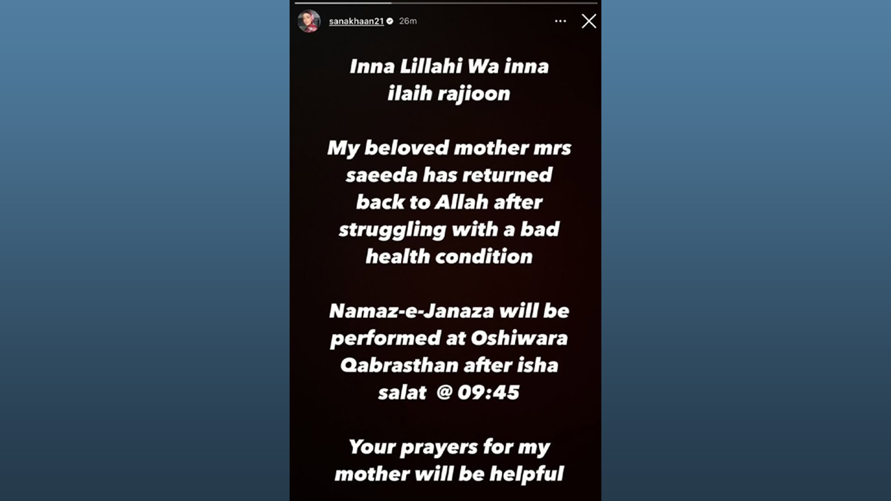 নিজের ইনস্টাগ্রাম হ্যান্ডেলে সানা খান এই হৃদয়বিদারক খবরটি শেয়ার করে জানান, তার মা মিসেস সাঈদা বহু বছর ধরে বিভিন্ন স্বাস্থ্যগত সমস্যার সঙ্গে লড়াই করছিলেন। তিনি লেখেন, ‘ইন্না লিল্লাহি ওয়া ইন্না ইলাইহি রাজিউন। আমার প্রিয় মা, মিসেস সাঈদা, দীর্ঘদিন অসুস্থতার সঙ্গে লড়াই করে আল্লাহর কাছে ফিরে গেছেন।’