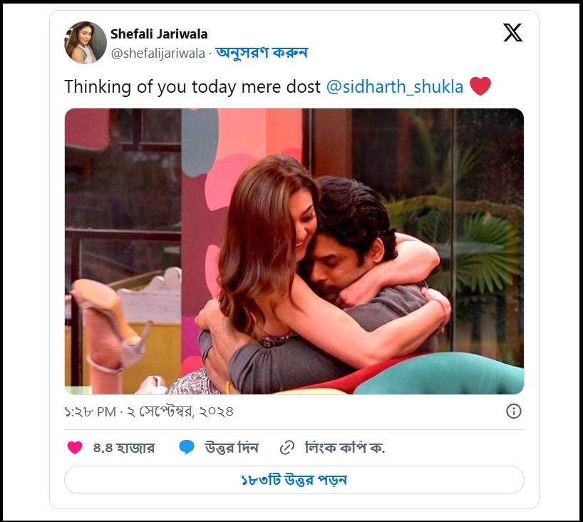 শেফালীর শেষ পোস্টে দেখা যায়, সিদ্ধার্থ শুক্লাকে জড়িয়ে ধরে আছেন তিনি। ক্যাপশনে লিখেছেন, ‘তোমাকে বড্ড মনে পড়ছে…’।
