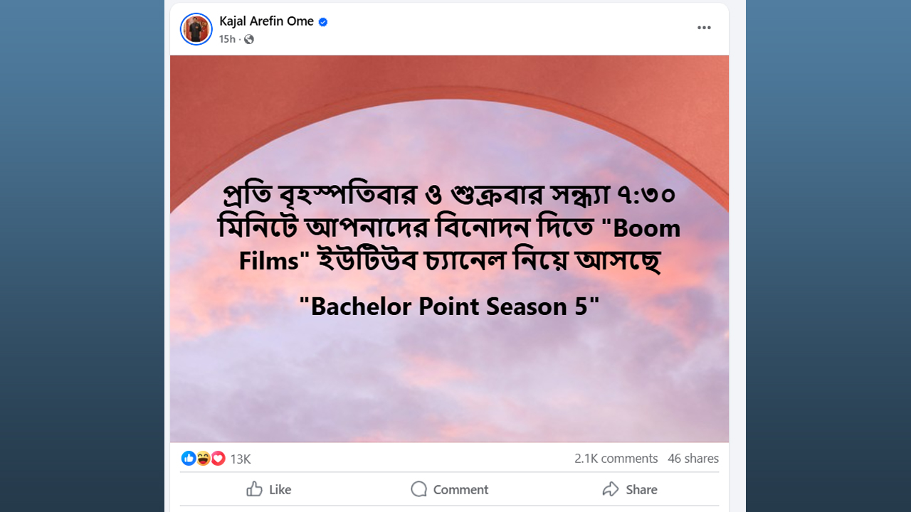কাজল আরিফিন অমি লিখেছেন, ‘প্রতি বৃহস্পতিবার ও শুক্রবার সন্ধ্যা ৭:৩০ মিনিটে আপনাদের বিনোদন দিতে "Boom Films" ইউটিউব চ্যানেল নিয়ে আসছে ‘ব্যাচেলর পয়েন্ট সিজন ৫’।’