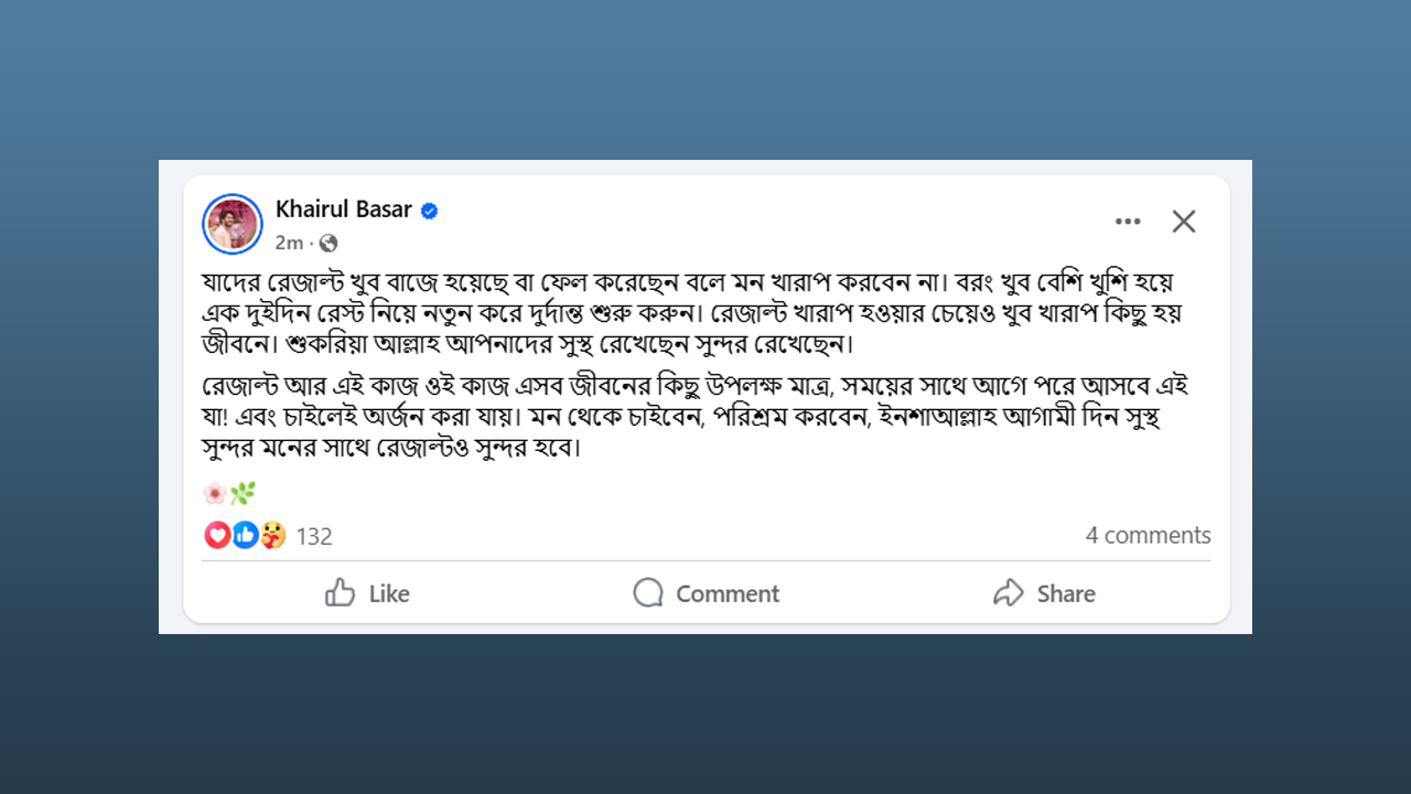 খায়রুল বাসার লিখেছেন, ‘যাদের রেজাল্ট খুব বাজে হয়েছে বা ফেল করেছেন বলে মন খারাপ করবেন না। বরং খুব বেশি খুশি হয়ে এক দুইদিন রেস্ট নিয়ে নতুন করে দুর্দান্ত শুরু করুন।’