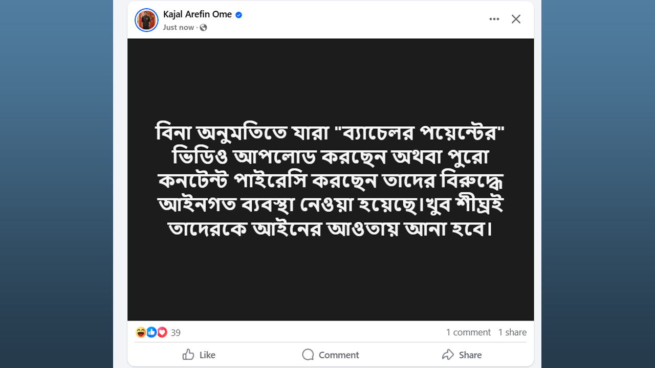 পোস্ট দিয়ে অমি লিখেছেন, ‘বিনা অনুমতিতে যারা ‘ব্যাচেলর পয়েন্টের’ ভিডিও আপলোড করছেন অথবা পুরো কনটেন্ট পাইরেসি করছেন তাদের বিরুদ্ধে আইনগত ব্যবস্থা নেওয়া হয়েছে।’