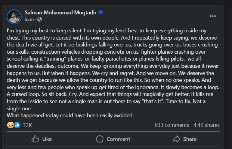 ‘আর আমি বারবার বলে যাচ্ছি, আমরা যে মৃত্যু পাই, সেটাই আমাদের প্রাপ্য। হোক সেটা আমাদের উপর ভবন ভেঙে পড়া, ট্রাক আমাদের উপর দিয়ে চলে যাওয়া, বাস আমাদের মাথা থেঁতলে দেওয়া, কনস্ট্রাকশনের গাড়ি আমাদের উপর কংক্রিট ফেলে দেওয়া, স্কুলের উপর ‘প্রশিক্ষণ’ বিমান ভেঙে পড়া, কিংবা ত্রুটিপূর্ণ প্যারাশুট বা বিমানে পাইলটদের মৃত্যু– আমরা সবাই সবচেয়ে ভয়ঙ্কর পরিণতিই প্রাপ্য।’