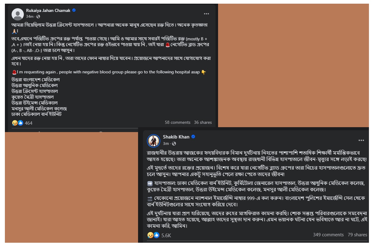 চিত্রনায়ক শাকিব খান এক স্ট্যাটাসে লিখেছেন, রাজধানীর উত্তরায় আজকের হৃদয়বিদারক বিমান দুর্ঘটনায় নিহতের পাশাপাশি শতাধিক শিক্ষার্থী মর্মান্তিকভাবে আহত হয়েছে। তারা অনেকে আশঙ্কাজনক অবস্থায় রাজধানী বিভিন্ন হাসপাতালে জীবন-মৃত্যুর সঙ্গে লড়াই করছে!