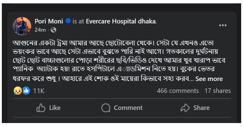পরী লেখেন, গতকালের দুর্ঘটনায় ছোট ছোট বাচ্চাগুলোর পোড়া শরীরের ছবি/ভিডিও দেখে আমার খুব খারাপভাবে প্যানিক অ্যাটাক হয়! রাতে হাসপাতালে ভর্তি হতে হয়। বুকের ভেতর ধরফর করে শুধু। আহারে এই শোক ওই মায়েরা কিভাবে সহ্য করবে আল্লাহ! আল্লাহ আল্লাহ……!