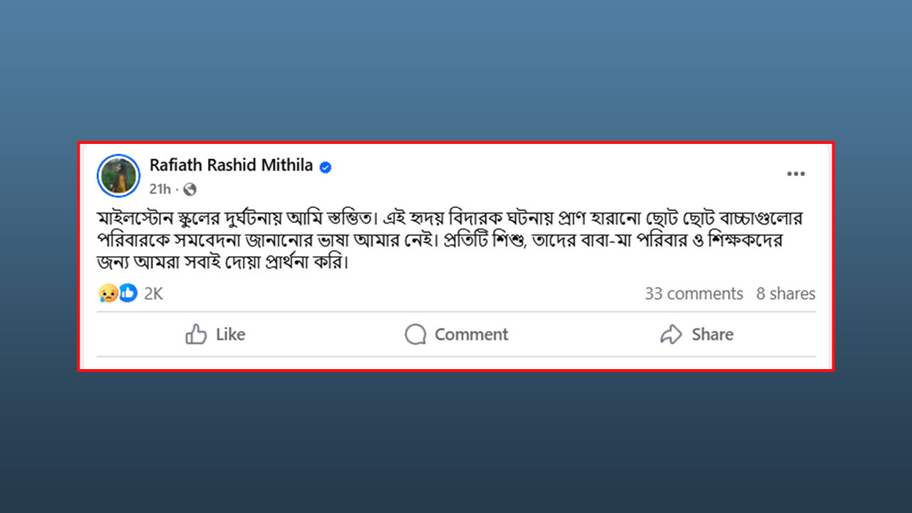 পোস্ট দিয়ে মিথিলা লিখেছেন, ‘মাইলস্টোন স্কুলের দুর্ঘটনায় আমি স্তম্ভিত। এই হৃদয় বিদারক ঘটনায় প্রাণ হারানো ছোট ছোট বাচ্চাগুলোর পরিবারকে সমবেদনা জানানোর ভাষা আমার নেই। প্রতিটি শিশু, তাদের বাবা-মা পরিবার ও শিক্ষকদের জন্য আমরা সবাই দোয়া প্রার্থনা করি।’