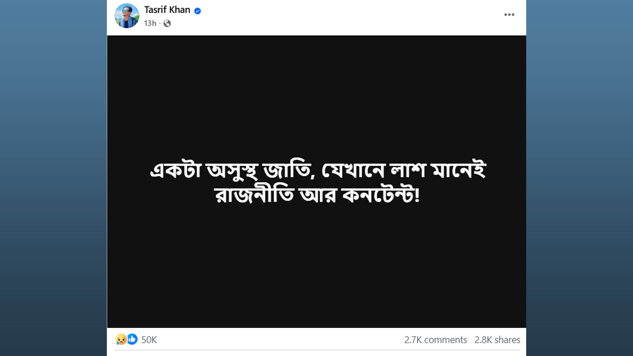 পোস্ট দিয়ে তাশরীফ খান লিখেছেন, ‘একটা অসুস্থ জাতি, যেখানে লাশ মানেই রাজনীতি আর কনটেন্ট।’ মন্তব্যের ঘরে নেটিজেনরা তাশরীফের সঙ্গে একাত্মতা প্রকাশ করেছেন।