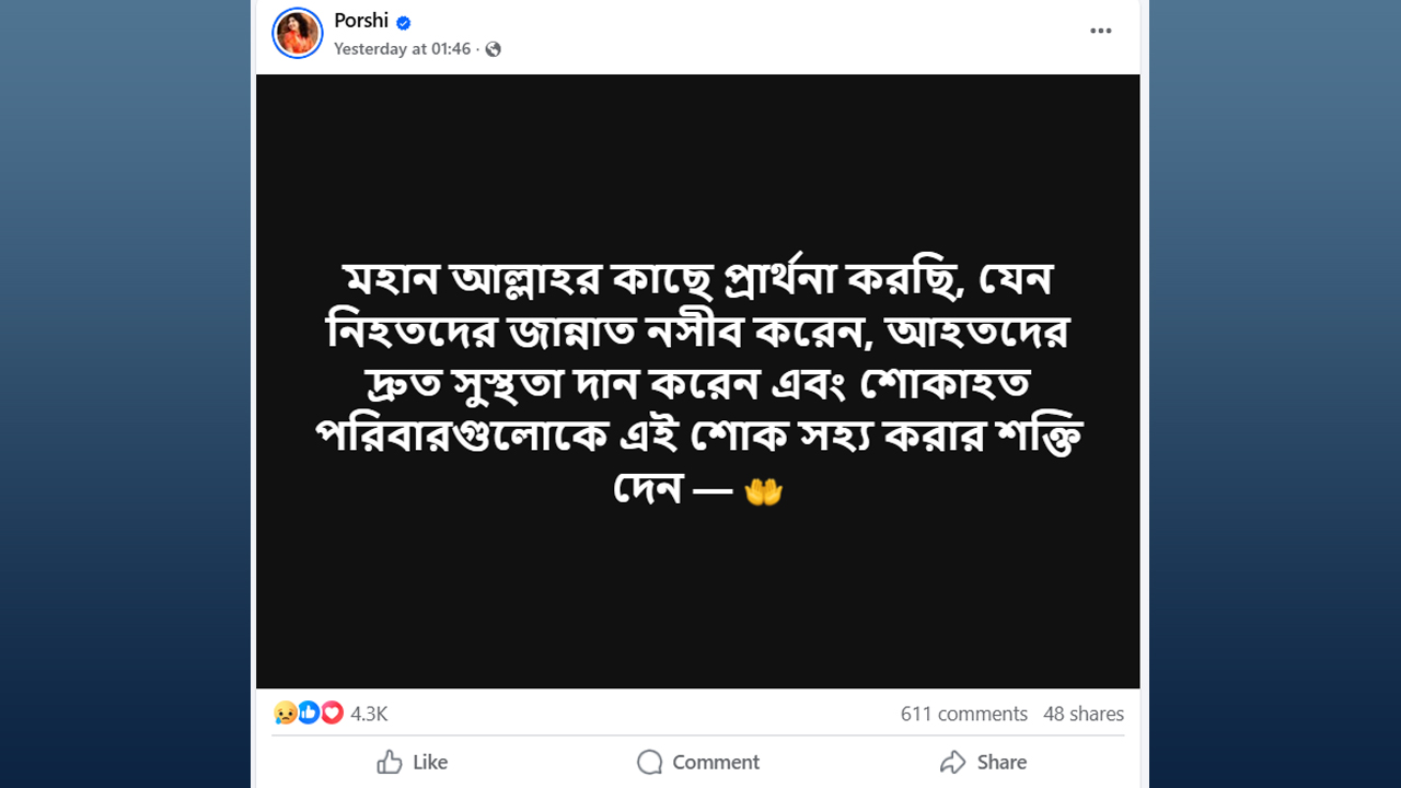 পড়শী লিখেছেন, ‘মহান আল্লাহর কাছে প্রার্থনা করছি, যেন নিহতদের জান্নাত নসীব করেন। আহতদের দ্রুত সুস্থতা দান করেন এবং শোকাহত পরিবারগুলোকে এই শোক সহ্য করার শক্তি দেন।’