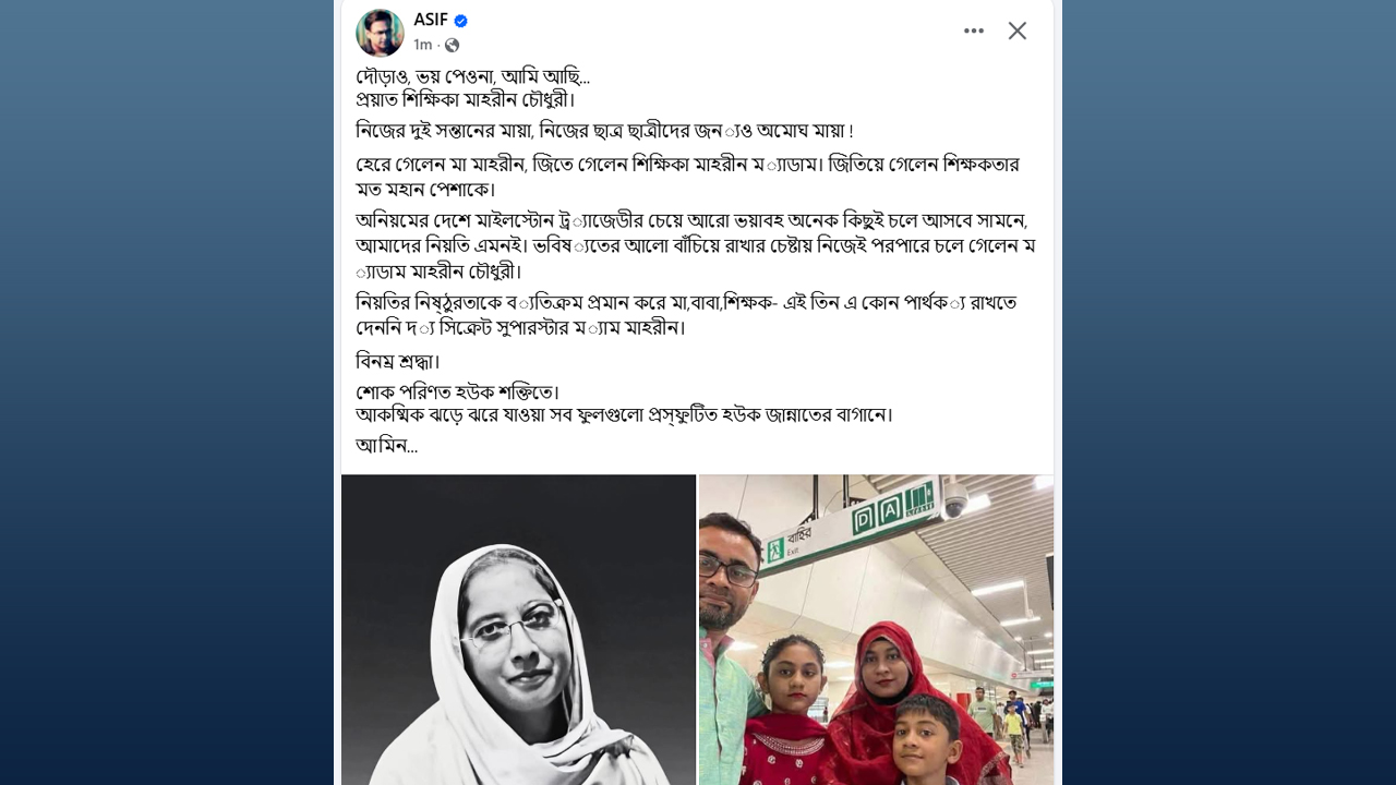 পোস্ট দিয়ে আসিফ আকবর লিখেছেন, ‘‘দৌড়াও, ভয় পেওনা আমি আছি।’ প্রয়াত শিক্ষিকা মাহেরীন চৌধুরী নিজের দুই সন্তানের মায়া, নিজের ছাত্রছাত্রীদের জন্যও অমোঘ মায়া। হেরে গেলেন মা মাহেরীন, জিতে গেলেন শিক্ষিকা মাহেরীন ম্যাডাম।’’