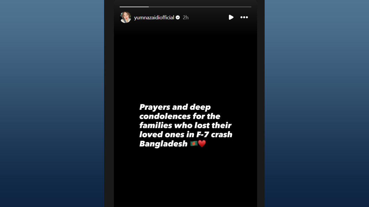 জনপ্রিয় পাকিস্তানি অভিনেত্রী ইয়ুমনা জায়েদি তার ইস্টাগ্রাম স্টোরিতে এক শোক বর্তা লিখেছেন বাংলাদেশের বিমান দুর্ঘটনা নিয়ে।