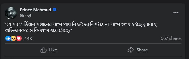 যেখানে তিনি প্রশ্ন ছুড়ে দিয়ে বলেছেন, ‘যে সব অভিভাবক সন্তানের লাশ পায়নি, তাদের তালিকা দেন। লাশ গুম হইছে বুঝলাম, অভিভাবকরাও কি গুম হয়ে গেছে?’