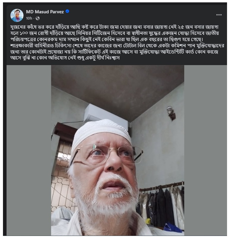 অভিনেতা তার পোস্টে আরও উল্লেখ করেন, ‘কেবিন ভাড়া যা ছিল এক বছরে, তা দ্বিগুণ হয়ে গেছে। সেবাদানকারী বাহিনীরাও চিকিৎসা শেষে টোটাল বিল থেকে কমিশন পান, মুক্তিযোদ্ধাদের জন্য তার কিছুই প্রযোজ্য নয়। কী সার্টিফিকেট এই কাজে আসে বা মুক্তিযোদ্ধা আইডেন্টিটি কার্ড কোনো কাজে আসে বুঝি না। কোনো অভিযোগ নেই, শুধু একটু দীর্ঘ নিঃশ্বাস।