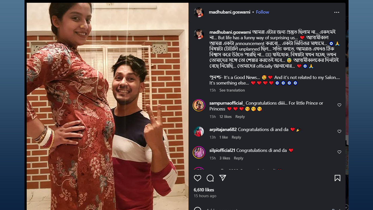 ছবিতে দেখা যাচ্ছে, মধুবনীর স্ফীতোদরের সামনে বসে আছেন রাজা গোস্বামী। ছবির ক্যাপশনে মধুবনী লিখেছেন, ‘আমরা এটার জন্য প্রস্তুত ছিলাম না, একদমই না কিন্তু জীবন আমাদের চমকে দেওয়ার জন্য নানা রকম মজার রাস্তা খুঁজে নেয়।’