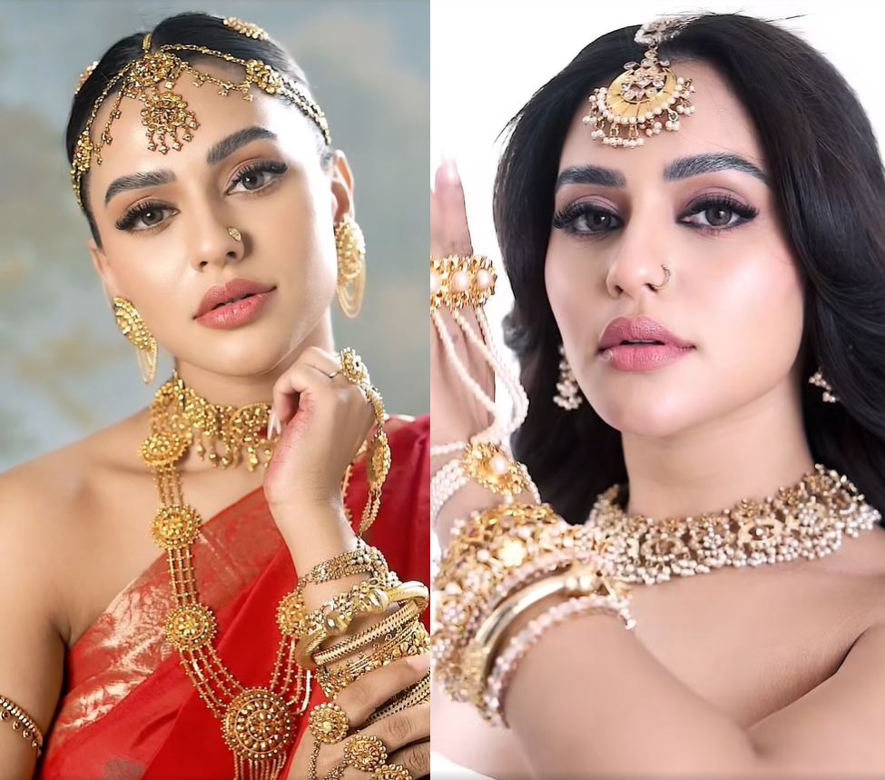 ভাইরাল হওয়া ভিডিওটিতে নুসরাত ফারিয়াকে দুটি ভিন্ন লুকে দেখা গেছে। প্রথম লুকে নুসরাত ফারিয়াকে একটি জমকালো লাল শাড়িতে দেখা গেছে, যা তাকে ফুটিয়ে তুলেছে ব্যাপক। সঙ্গে ভারি গয়নায় সেজে উঠেছেন। কপালে টিকলি, কানে ঝুমকো ধরনের ভারী দুল এবং গলায় একটি চওড়া নেকলেস। নাকে ছোট একটি নোজ রিং, হাতে মানানসই চুড়ি ও বালা- সব মিলিয়ে তার সাজে ছিল রাজকীয় এক আভিজাত্যের ছাপ।