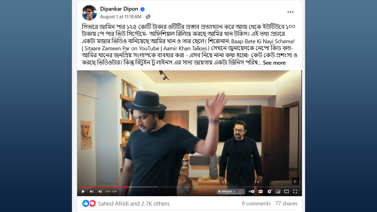 দীপন তার পোস্টে উল্লেখ করেছেন, আমির খানের নতুন সিনেমাটি ১২৫ কোটি টাকার ওটিটি প্রস্তাব প্রত্যাখ্যান করে ইউটিউবে ১০০ টাকায় ‘পে পার ভিউ’ সিস্টেমে মুক্তি দেওয়া হচ্ছে। এই সিদ্ধান্তের প্রচারণার জন্য আমির তার ছেলে জুনায়েদের সঙ্গে একটি ভিডিও তৈরি করেছেন। এই ভিডিওতে আমির নিজেকে ‘নেপো কিড’ হিসেবে আখ্যায়িত করা থেকে শুরু করে নানা ধরনের কৌতুক করেছেন। তবে দীপংকরের মতে, এই হাসির আড়ালে আমির খান তার দুটি ব্যর্থ সিনেমা, ‘থাগস অব হিন্দুস্তান’ এবং ‘লাল সিং চাড্ডা’র ব্যর্থতা নিয়ে আবারও কথা বলেছেন।