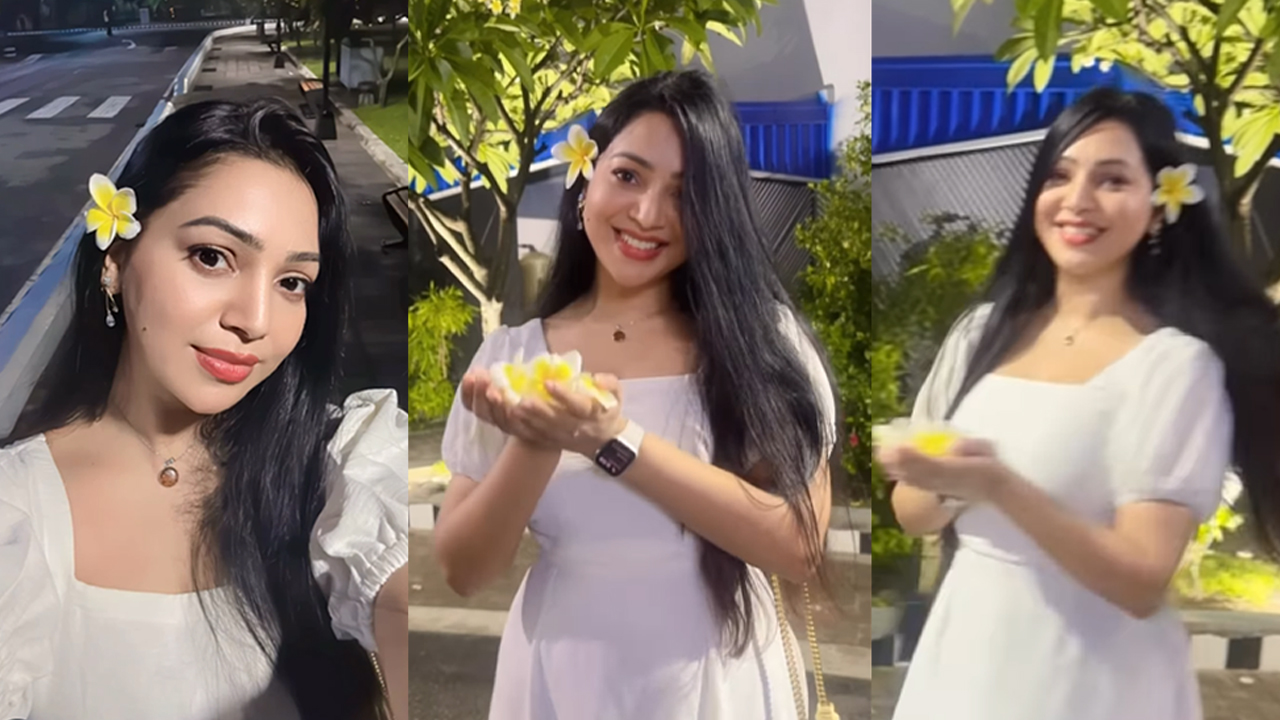 ভিডিওতে দেখা যায়, তিনি একটি সাদা ফ্রক পরে রাস্তার ধারে দাঁড়িয়ে আছেন এবং তার হাতে রয়েছে কাঠগোলাপ। হালকা হাসি আর কাঠগোলাপের শুভ্রতা যেন মিলেমিশে একাকার হয়ে এক মায়াবী দৃশ্যের সৃষ্টি করেছে।
