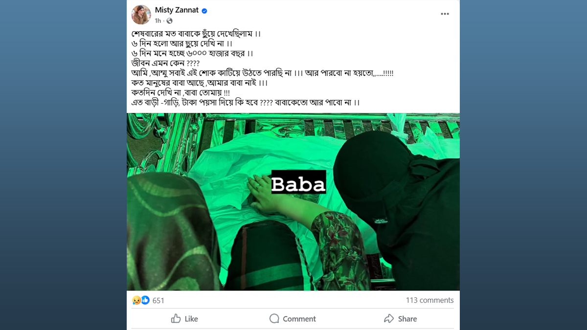 গত ৬ দিন ধরে মিষ্টি জান্নাত তার বাবাকে না দেখতে পাওয়ার বেদনায় কাতর। সামাজিক যোগাযোগ মাধ্যমে একাধিক আবেগঘন পোস্ট দিয়ে তিনি তার অনুভূতির কথা প্রকাশ করেছেন। একটি পোস্টে তিনি লেখেন, ‘শেষবারের মতো বাবাকে ছুঁয়ে দেখেছিলাম, ৬ দিন হলো আর ছুঁয়ে দেখি না। ৬ দিন মনে হচ্ছে ৬০০০ হাজার বছর।’