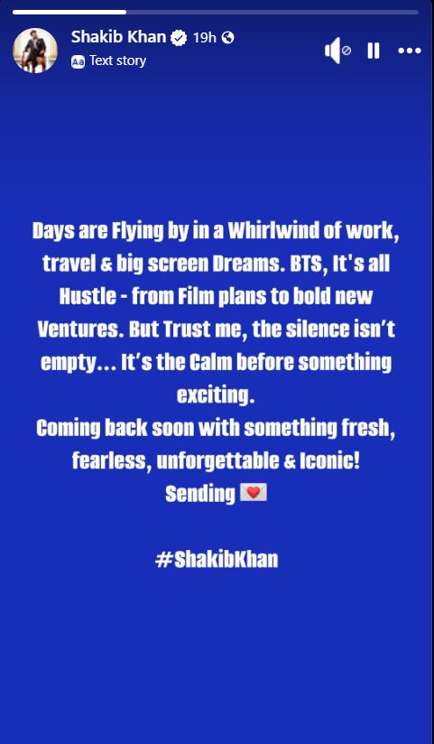 শুক্রবার তার ফেসবুক পেজের একটি স্টোরিতে শাকিব খান লিখেছেন, ‘বড় পর্দার জন্য বড় বড় স্বপ্ন নিয়ে দিনের পর দিন ছুটোছুটি চলছে। এই সময়ের নীরবতা মানে কোনো শূন্যতা নয়; বরং এটি এমন একটি মুহূর্ত যা চুপচাপ রয়েছে বড় কিছু ঘটার অপেক্ষায়।’