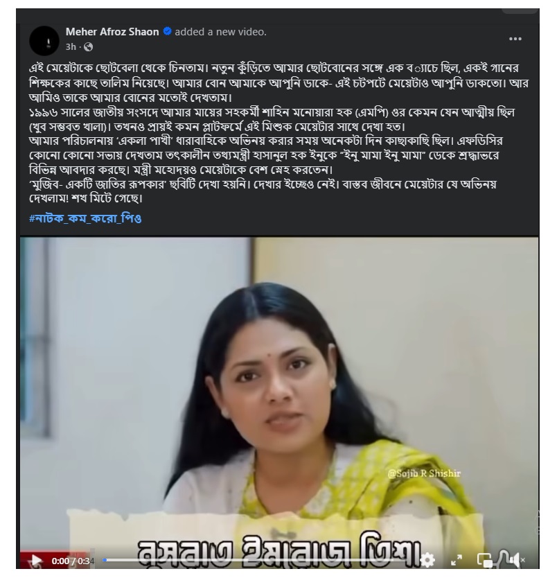 তারই ধারাবাহিকতায় এবার ‘মুজিব’ সিনেমায় শেখ ফজিলাতুন্নেসা চরিত্রে অভিনয় করা নুসরাত ইমরোজ তিশার সমালোচনা করে ফেসবুকে পোস্ট করেছেন। যেখানে তিশাকে উদ্দেশ্য করে টিপ্পনি কেটে শাওন বলেছেন, ‘নাটক কম করো পিও’।