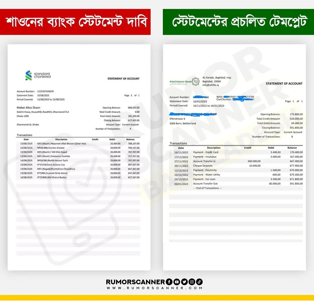 তাদের তদন্তে একাধিক অসঙ্গতি ধরা পড়ে। এর মধ্যে উল্লেখযোগ্য হলো— স্টেটমেন্টে দেখানো অ্যাকাউন্ট নম্বরটি ১৩ সংখ্যার হলেও সেই ব্যাংকের অ্যাকাউন্ট নম্বর ১১ ডিজিটের। এছাড়াও যাচাই করে এই নম্বরের বিপরীতে কোনো অ্যাকাউন্টের অস্তিত্ব পাওয়া যায়নি। সঙ্গে লেনদেনের তথ্যকেও অস্বাভাবিক বলছে রিউমর স্ক্যানার। তাদের মতে, ভাইরাল হওয়া স্টেটমেন্টে টাকা গ্রহীতার নাম উল্লেখ থাকলেও, এসসিবির আসল স্টেটমেন্টে গ্রহীতার নাম বা অ্যাকাউন্ট নম্বর প্রকাশ করা হয় না।