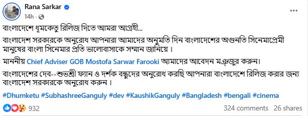 এই প্রযোজক আরও লিখেছেন, ‘বাংলাদেশের দেব-শুভশ্রী ফ্যান ও দর্শক বন্ধুদের অনুরোধ করছি, আপনারা বাংলাদেশে রিলিজের জন্য সরকারকে অনুরোধ করুন।’