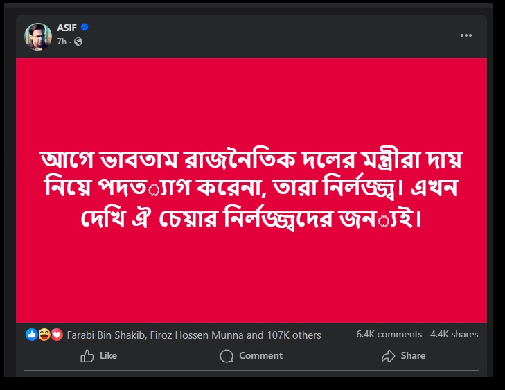শনিবার (৩০ আগস্ট) সকালে দেওয়া ওই স্ট্যাটাসে আসিফ লিখেছেন, ‘আগে ভাবতাম রাজনৈতিক দলের মন্ত্রীরা দায় নিয়ে পদত্যাগ করে না, তারা নির্লজ্জ। এখন দেখি ঐ চেয়ার নির্লজ্জদের জন্যই।’
