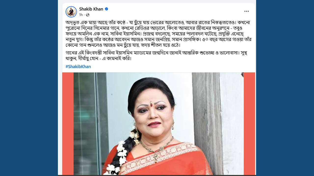 এদিকে মেগাস্টার শাকিব খান এক পোস্ট দিয়ে সাবিনা ইয়াসমিনকে নিয়ে লিখেছেন, ‘অদ্ভুত এক মায়া আছে তার কণ্ঠে - যা ছুঁয়ে যায় ভোরের আলোতেও, আবার রাতের নিস্তব্ধতাতেও। কখনো পুরোনো দিনের সিনেমার গানে, কখনো রেডিওর আড়ালে কিংবা আমাদের জীবনের অনুরণনে। তবুও হৃদয়ে অমলিন এক নাম, সাবিনা ইয়াসমিন।’