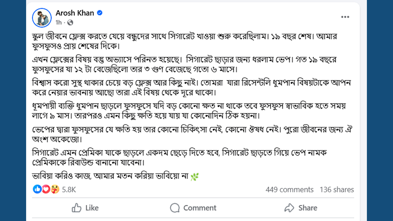 পোস্ট দিয়ে আরশ খান লিখেছেন, ‘স্কুল জীবনে ফ্লেক্স করতে যেয়ে বন্ধুদের সাথে সিগারেট খাওয়া শুরু করেছিলাম। ১৯ বছর শেষ। আমার ফুসফুসও প্রায় শেষের দিকে। এখন ফ্লেক্সের বিষয় বস্তু অভ্যাসে পরিনত হয়েছে।’