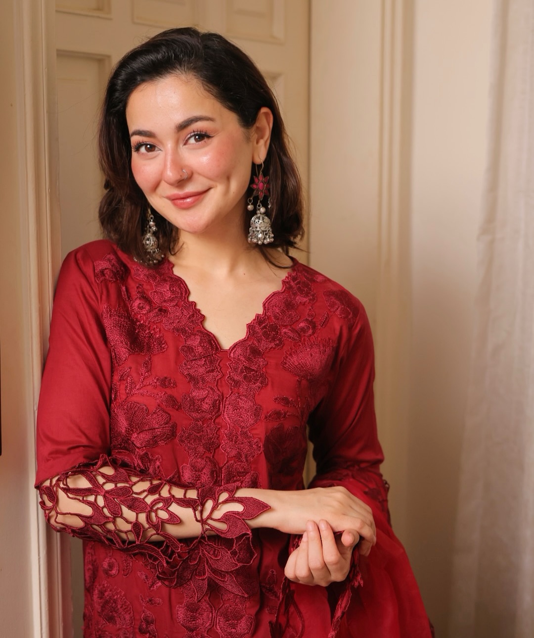 এই ছবিতে হানিয়াকে মেরুন রঙের ঐতিহ্যবাহী পোশাকে দেখা যাচ্ছে। ছবির সাদামাটা ব্যাকগ্রাউন্ড তার চেহারার সৌন্দর্যকে আরও ফুটিয়ে তুলেছে।