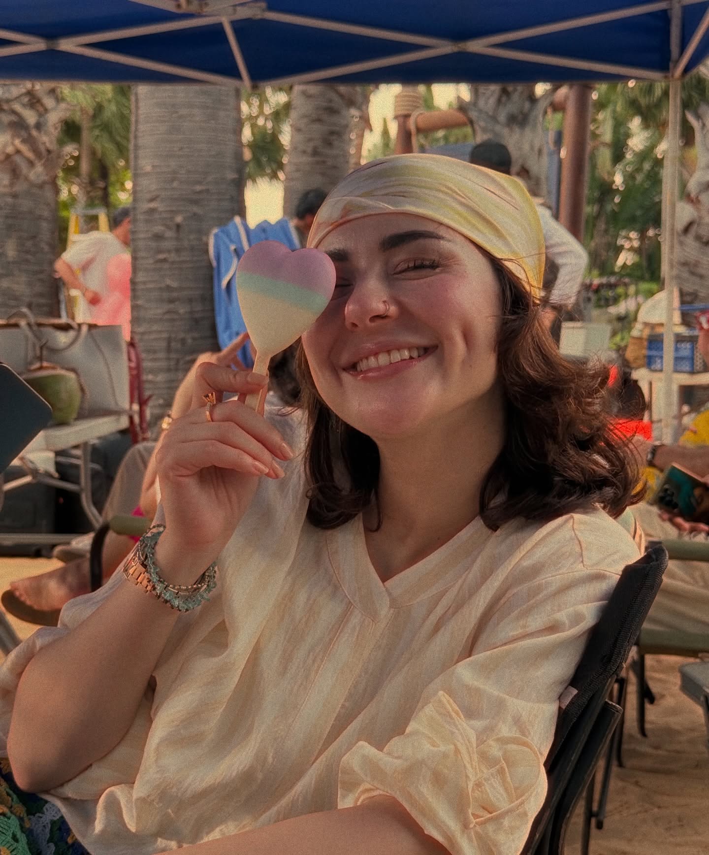 সাদা রঙের পোশাক মাথায় স্কার্ফ বেঁধে ধরা দিয়েছেন হানিয়া, হাতে একটি হার্ট-শেপড আইসক্রিম নিয়ে তিনি ক্যামেরার দিকে তাকিয়ে হাসছেন।