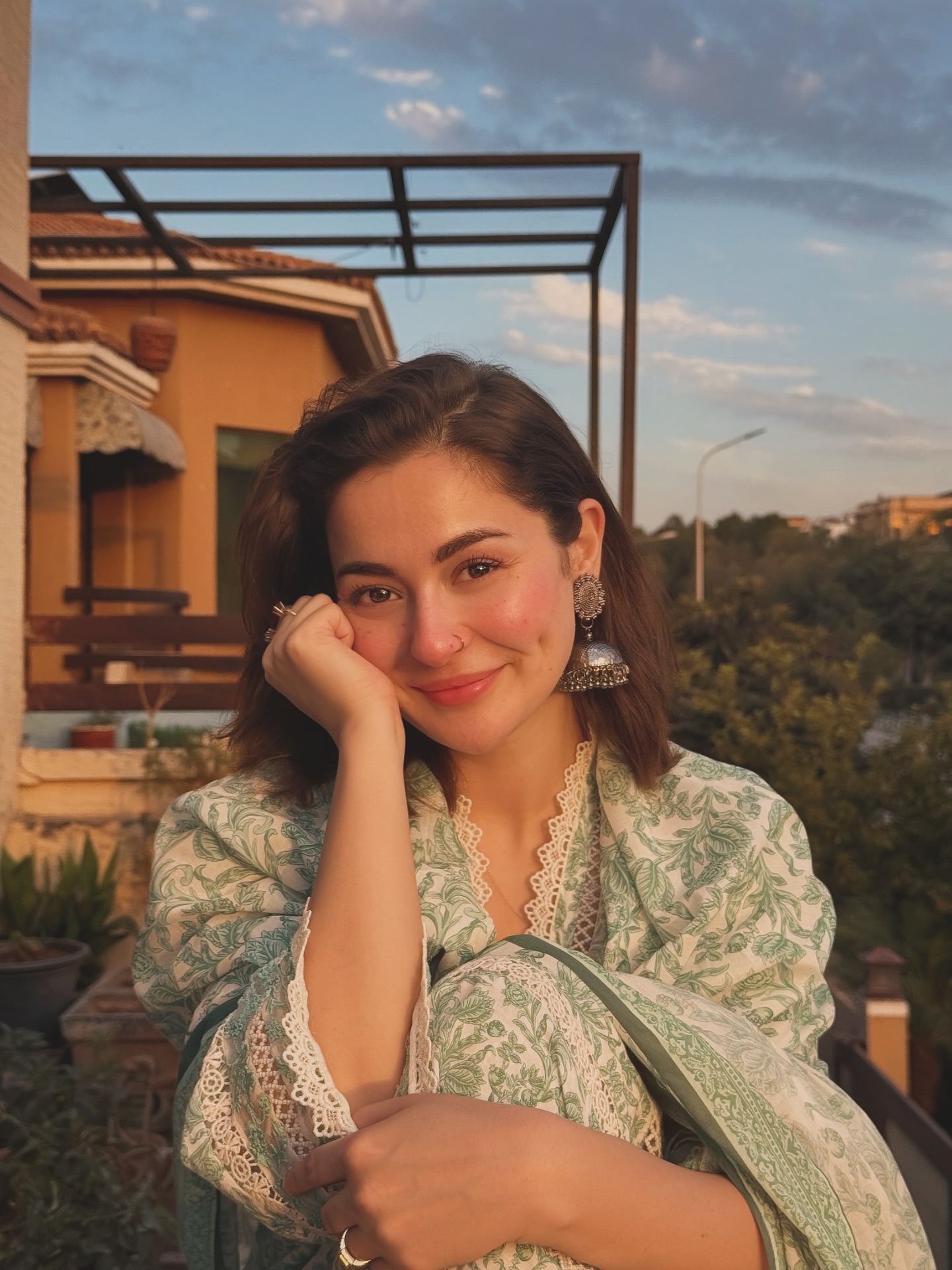 সাদা ও সবুজ রঙের প্রিন্টেড পোশাকে বসে আছেন হানিয়া। কানের বড় ঝুমকা পোশাকের সঙ্গে দারুণ মানিয়েছে। সূর্যাস্তের সোনালি আলো তাকে আরও মায়াবী করে তুলেছে।