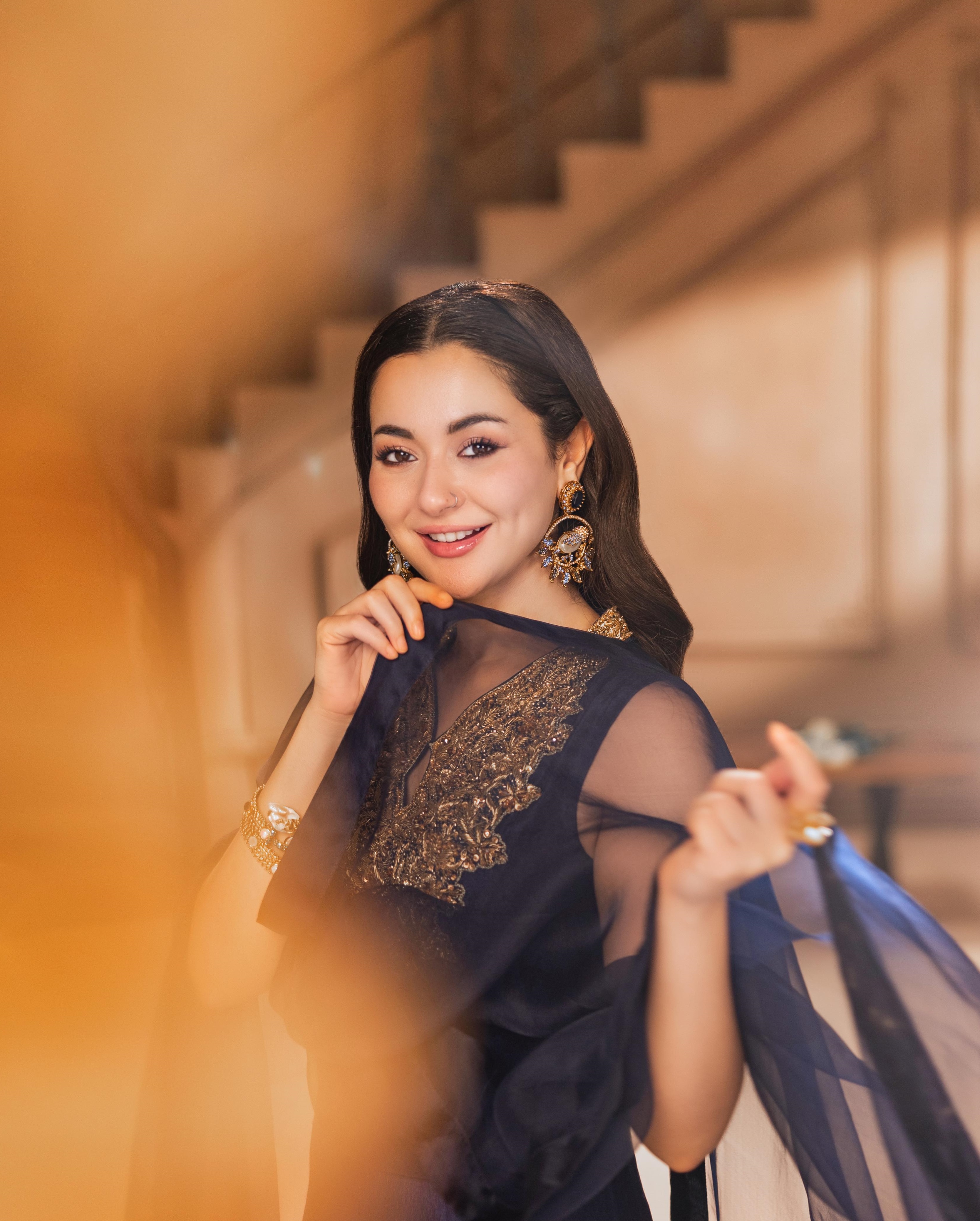 এই ছবিতে হানিয়াকে একটি জমকালো নীল রঙের পোশাকে দেখা যাচ্ছে, যার ওপর সোনালি সুতার সূক্ষ্ম কাজ করা। আকর্ষণীয় কানের দুল, হাতে ব্রেসলেট এবং হালকা মেকআপ তার সৌন্দর্যকে আরও বাড়িয়ে তুলেছে।