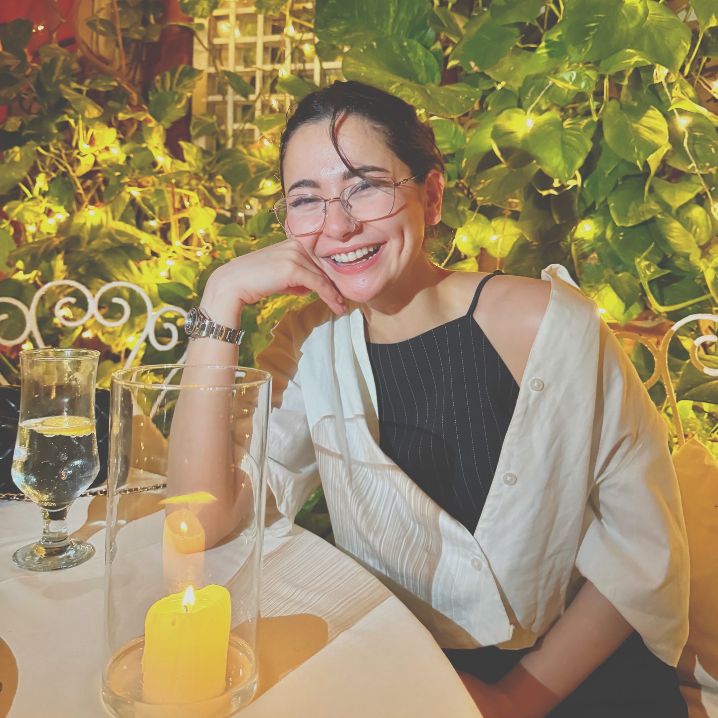হানিয়াকে একটি রেস্টুরেন্টে টেবিলে বসে হাসতে দেখা যাচ্ছে। তার পরনে সাদা শার্ট এবং ভেতরে কালো স্ট্রাইপড টপ। চশমা এবং ঘড়ি তার এই ক্যাজুয়াল লুকটিকে আরও আকর্ষণীয় করেছে।