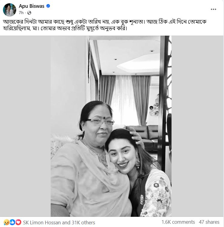 সেখানে অপু বিশ্বাস লেখেন, ‘আজকের দিনটা আমার কাছে শুধু একটা তারিখ নয়, এক বুক শূন্যতা। আজ ঠিক এই দিনে তোমাকে হারিয়েছিলাম, মা। তোমার অভাব প্রতিটি মুহূর্তে অনুভব করি।’