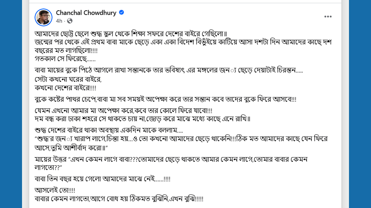 এবার মা ও ছেলেকে নিয়ে এক আবেগঘন পোস্ট দিয়েছেন চঞ্চল চৌধুরী। তার কথায়, ‘আমাদের ছোট্ট ছেলে শুদ্ধ স্কুল থেকে শিক্ষা সফরে দেশের বাইরে গেছিলো। জন্মের পর থেকে এই প্রথম বাবা মাকে ছেড়ে একা একা বিদেশ বিভুঁইয়ে কাটিয়ে আসা দশটা দিন আমাদের কাছে দশ বছরের মত লাগছিলো।’