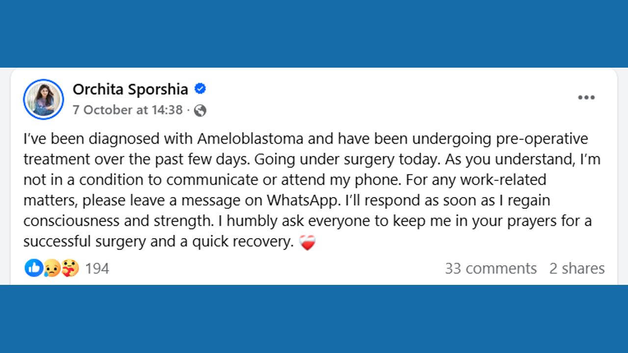 স্পর্শিয়া লিখেছেন, ‘আমি অ্যামেলোব্লাস্টোমা রোগে আক্রান্ত এবং গত কয়েকদিন ধরে অপারেশনের আগে চিকিৎসার মধ্যে আছি। আজ আমার অপারেশন হবে। আপনারা বুঝতেই পারছেন, এই অবস্থায় আমার পক্ষে কারো সাথে যোগাযোগ করা বা ফোন ধরা সম্ভব নয়।’