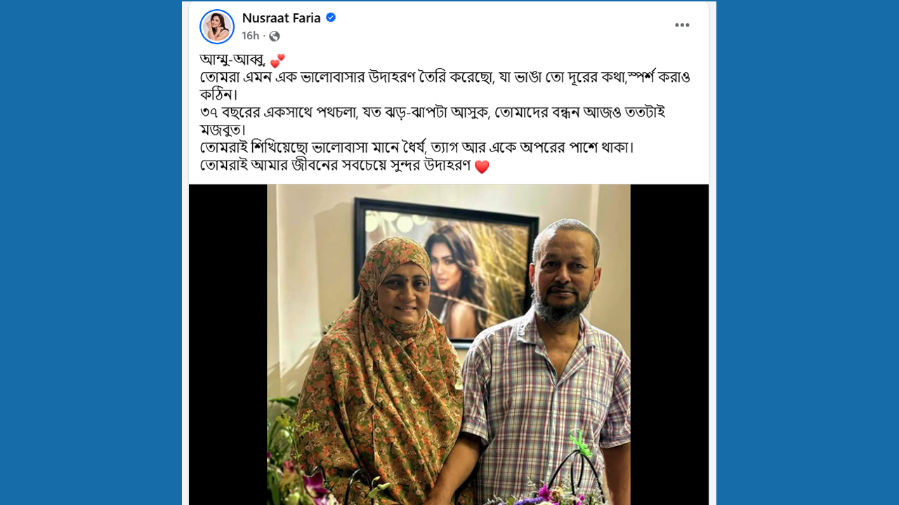 মা-বাবার ৩৭ বছরের দাম্পত্য জীবনের প্রসঙ্গ টেনে ফারিয়া লেখেন, ‘আম্মু-আব্বু, তোমরা এমন এক ভালোবাসার উদাহরণ তৈরি করেছো, যা ভাঙা তো দূরের কথা, স্পর্শ করাও কঠিন। ৩৭ বছরের একসাথে পথচলা যত ঝড়-ঝাপটাই আসুক তোমাদের বন্ধন আজও ততটাই মজবুত।’