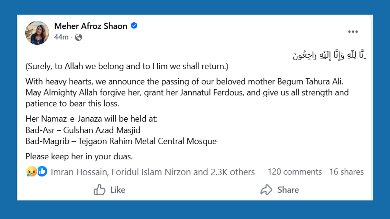 পোস্টে তিনি লেখেন, ‘গভীর শোকের সঙ্গে জানাচ্ছি যে আমাদের প্রিয় মা বেগম তাহুরা আলী ইন্তেকাল করেছেন। পরম করুণাময় আল্লাহ তাআলা যেন তাকে মাফ করে দেন।