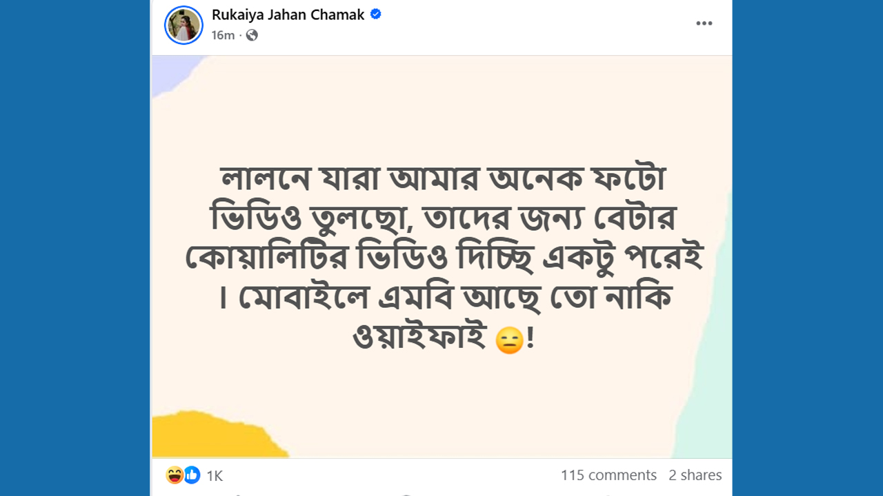 এক পোস্টে রুকাইয়া জাহান চমক জানান, বেটার কোয়ালিটির ভিডিও দিচ্ছি একটু পরেই।