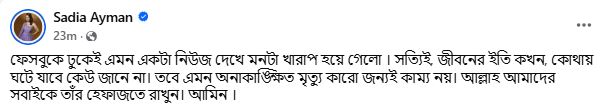 সংবাদটি শোনার পর সোশ্যাল মিডিয়ায় তার মনের গভীর কষ্ট প্রকাশ করেছেন অভিনেত্রী। সংবাদের একটি ফটোকার্ড শেয়ার করে তিনি লিখেছেন, ‘ফেসবুকে ঢুকেই এমন একটা নিউজ দেখে মনটা খারাপ হয়ে গেলো। সত্যিই, জীবনের ইতি কখন, কোথায় ঘটে যাবে কেউ জানে না। তবে এমন অনাকাঙ্ক্ষিত মৃত্যু কারো জন্যই কাম্য নয়। আল্লাহ আমাদের সবাইকে তাঁর হেফাজতে রাখুন। আমিন।’