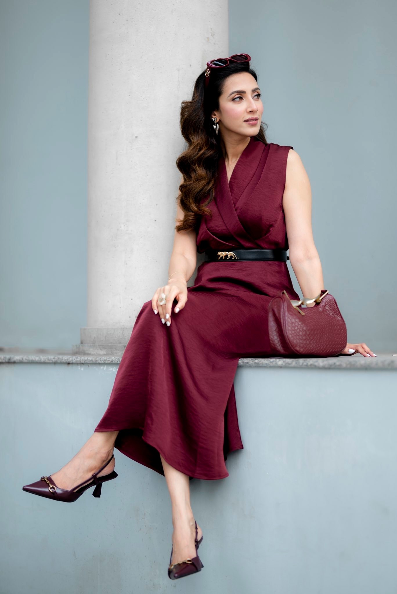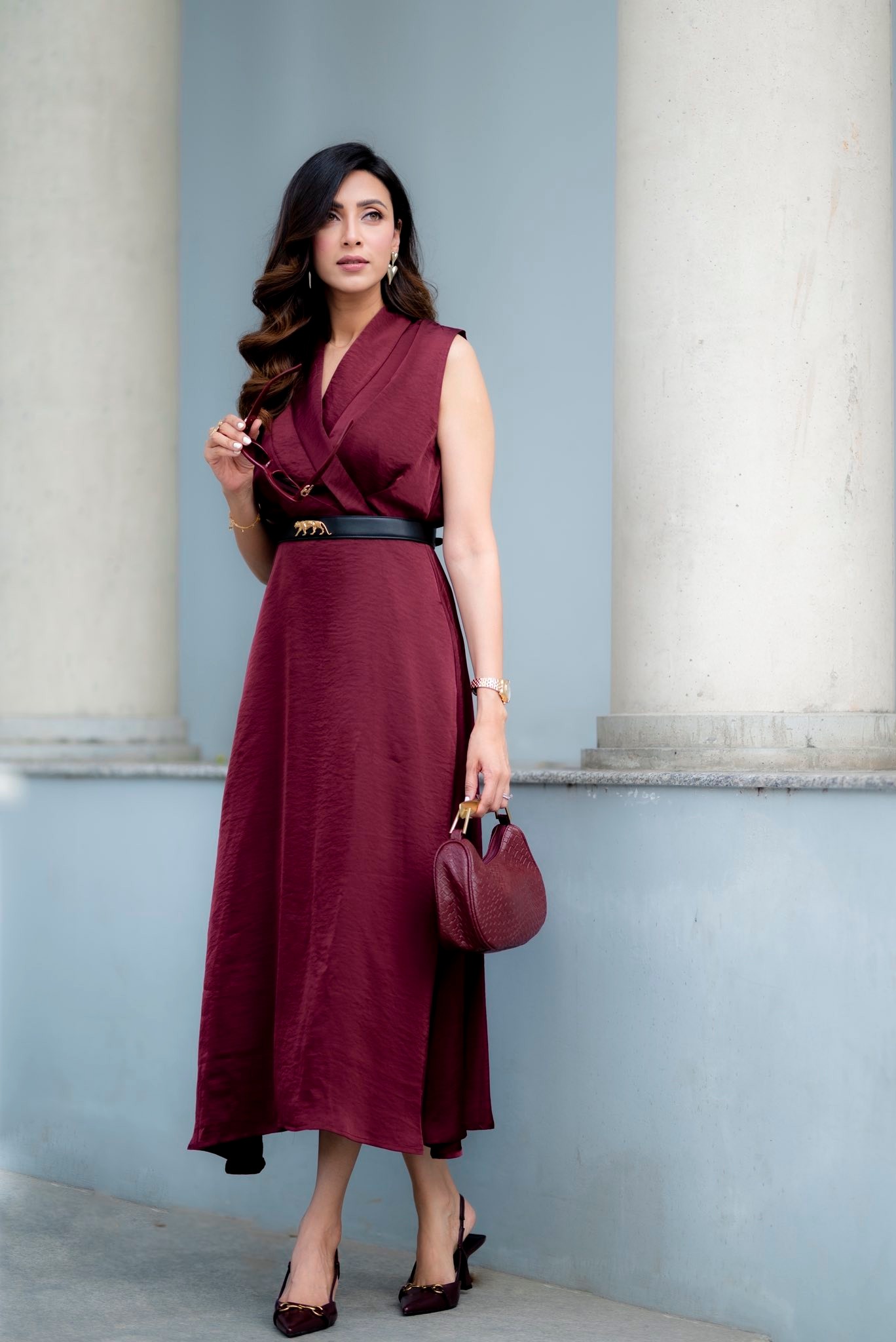 ছবিগুলোতে মিমকে দেখা যায় ক্লাসিক ও আভিজাত্যের এক অনন্য মিশ্রণে। তার পরনে ছিল গাঢ় খয়েরি বা মেরুন রঙের একটি স্লিভলেস, ফ্লোর-টাচ পোশাক, যা তাকে করে তোলে আকর্ষণীয়। পোশাকটির সঙ্গে কোমরে থাকা সরু কালো বেল্ট আলাদা মাত্রা যোগ করে।