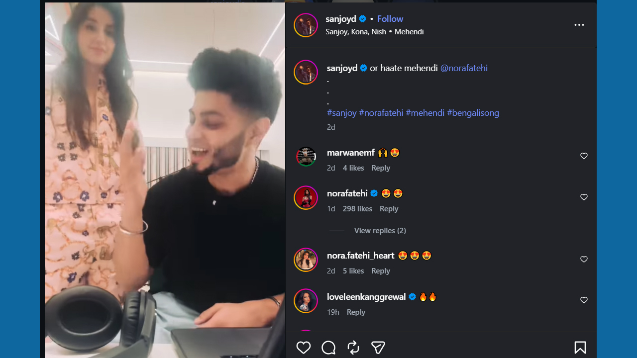 ভিডিওটি শেয়ার করে ক্যাপশনে সানজয় লিখেছেন, ‘ওর হাতে মেহেন্দি।’ নোরার এই ভিডিওটি প্রকাশ্যে আসতেই তা নিয়ে শোরগোল পড়ে গেছে। নেটিজেনরা রীতিমতো মুগ্ধতা প্রকাশ করছেন। কমেন্ট বক্সে নোরা নিজেও ভালোবাসা জানিয়েছেন ইমোজির মাধ্যমে।
